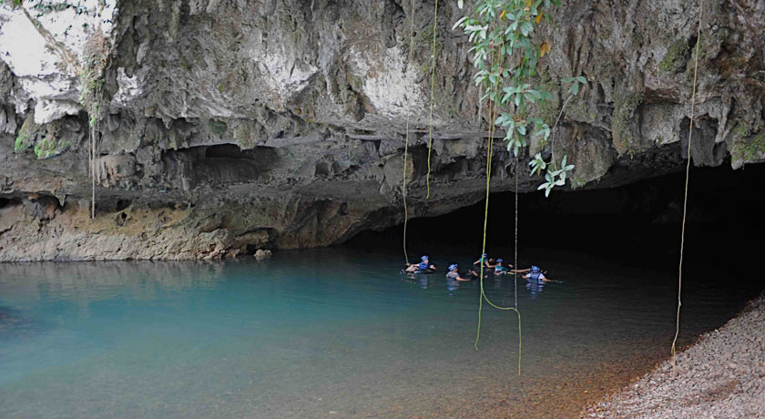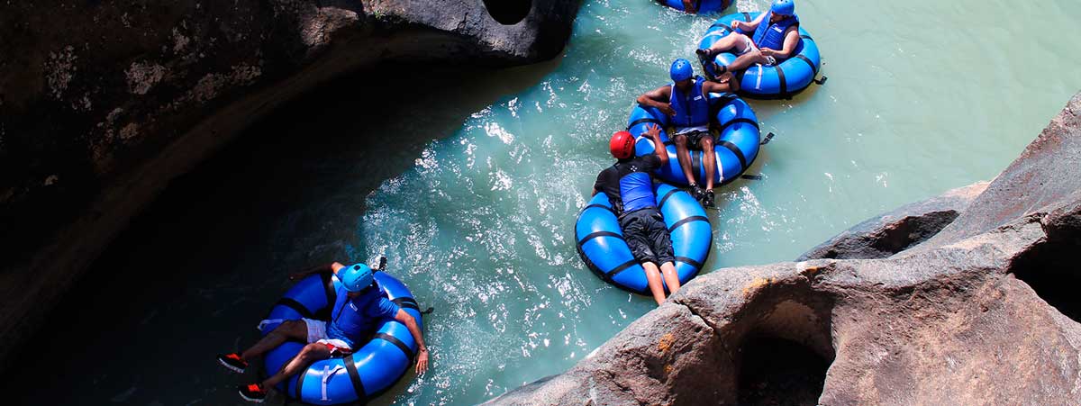 Entering along the Lower Macal River the float downstream is quick along the rapids and slow moving most of the way. The riverbanks are heavily forested and outcrops of limestone rocks protrude along the gorges many tropical fish, turtles and river otters share the clear mountain water. Swimming and swinging from vines is also added to this adventure.